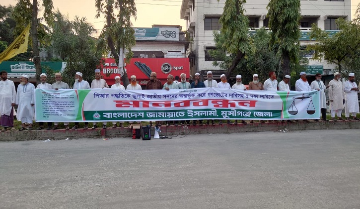 পিআর (প্রোপোরশনাল রিপ্রেজেন্টেশন) পদ্ধতিতে নির্বাচনসহ পাঁচ দফা দাবিতে মুন্সীগঞ্জে মানববন্ধন করেছে বাংলাদেশ জামায়াতে ইসলামী।