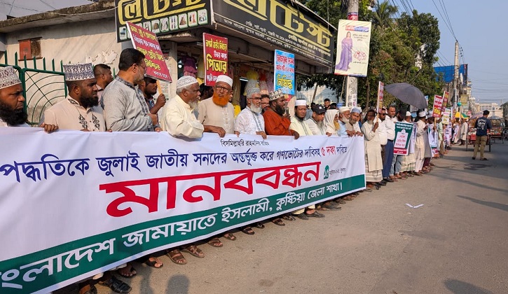 জুলাই জাতীয় সনদে পিআর (প্রোপোরশনাল রিপ্রেজেন্টেশন) পদ্ধতি অন্তর্ভুক্ত করে গণভোটের দাবিসহ পাঁচ দফা দাবিতে বাংলাদেশ জামায়াতে ইসলামী কুষ্টিয়া জেলা শাখার উদ্যোগে এক বিশাল মানববন্ধন অনুষ্ঠিত হয়েছে।
