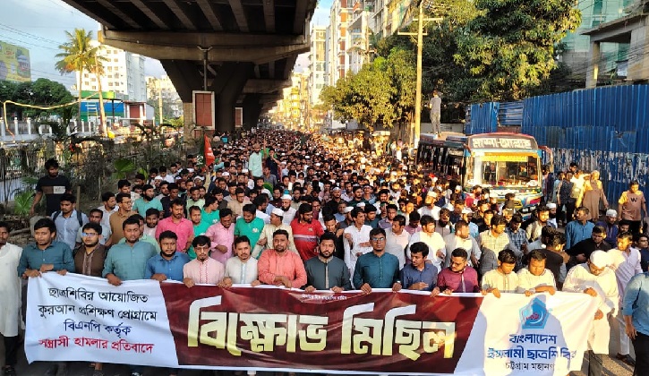 নোয়াখালীর কাশেম বাজার জামে মসজিদে ছাত্রশিবিরের কুরআন প্রশিক্ষণ প্রোগ্রামে ছাত্রদল- যুবদলের হামলার প্রতিবাদে বিক্ষোভ মিছিল ও সমাবেশ করেছে ছাত্রশিবির চট্টগ্রাম মহানগর শাখা।